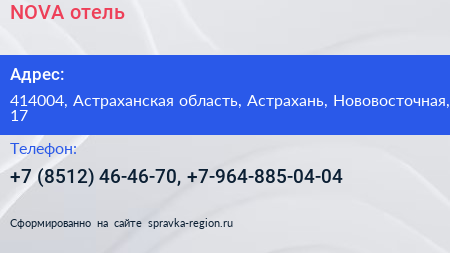NOVA, отель по адресу 414004, Астраханская область, Астрахань, Нововосточная, 17 в дальнейшем Организация, размещена в следующих категориях: