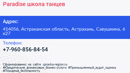 Paradise, школа танцев по адресу 414056, Астраханская область, Астрахань, Савушкина, 6 к27 в дальнейшем Организация, размещена в следующих категориях: