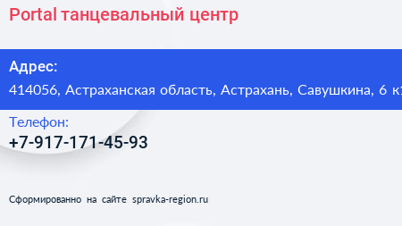 Portal, танцевальный центр по адресу 414056, Астраханская область, Астрахань, Савушкина, 6 к1 в дальнейшем Организация, размещена в следующих категориях: