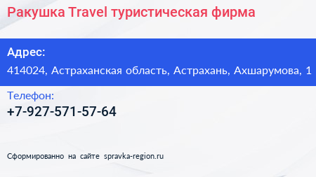 Ракушка Travel, туристическая фирма по адресу 414024, Астраханская область, Астрахань, Ахшарумова, 1 в дальнейшем Организация, размещена в следующих категориях: