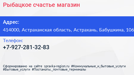 Рыбацкое счастье, магазин по адресу 414000, Астраханская область, Астрахань, Бабушкина, 106 в дальнейшем Организация, размещена в следующих категориях:
