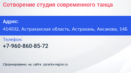 Сотворение, студия современного танца по адресу 414032, Астраханская область, Астрахань, Аксакова, 14Б в дальнейшем Организация, размещена в следующих категориях: