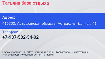 Татьяна, база отдыха по адресу 416303, Астраханская область, Астрахань, Дачная, 41 в дальнейшем Организация, размещена в следующих категориях: