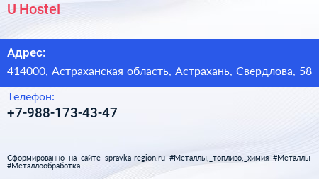 U Hostel по адресу 414000, Астраханская область, Астрахань, Свердлова, 58 в дальнейшем Организация, размещена в следующих категориях: