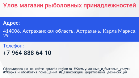 Улов, магазин рыболовных принадлежностей по адресу 414006, Астраханская область, Астрахань, Карла Маркса, 29 в дальнейшем Организация, размещена в следующих категориях: