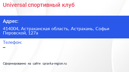Universal, спортивный клуб по адресу 414004, Астраханская область, Астрахань, Софьи Перовской, 127а в дальнейшем Организация, размещена в следующих категориях: