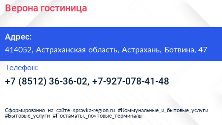Верона, гостиница по адресу 414052, Астраханская область, Астрахань, Ботвина, 47 в дальнейшем Организация, размещена в следующих категориях:
