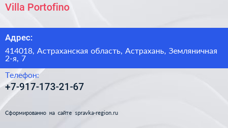 Villa Portofino по адресу 414018, Астраханская область, Астрахань, Земляничная 2-я, 7 в дальнейшем Организация, размещена в следующих категориях: