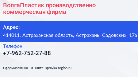 ВолгаПластик, производственно-коммерческая фирма по адресу 414011, Астраханская область, Астрахань, Садовских, 17а в дальнейшем Организация, размещена в следующих категориях: