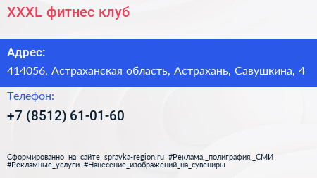 XXXL, фитнес-клуб по адресу 414056, Астраханская область, Астрахань, Савушкина, 4 в дальнейшем Организация, размещена в следующих категориях:
