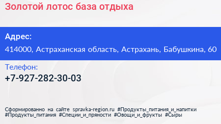 Золотой лотос, база отдыха по адресу 414000, Астраханская область, Астрахань, Бабушкина, 60 в дальнейшем Организация, размещена в следующих категориях: