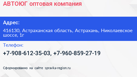 АВТОЮГ, оптовая компания по адресу 416130, Астраханская область, Астрахань, Николаевское шоссе, 1г в дальнейшем Организация, размещена в следующих категориях: