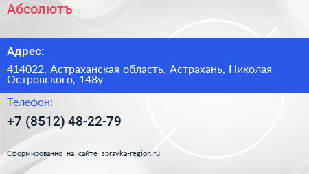 Абсолютъ по адресу 414022, Астраханская область, Астрахань, Николая Островского, 148у в дальнейшем Организация, размещена в следующих категориях:
