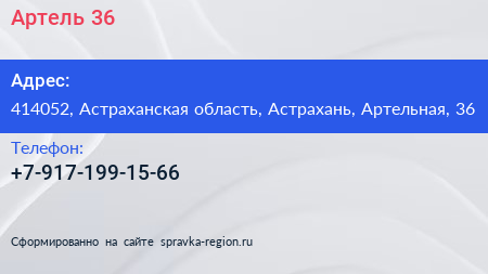 Артель 36 по адресу 414052, Астраханская область, Астрахань, Артельная, 36 в дальнейшем Организация, размещена в следующих категориях: