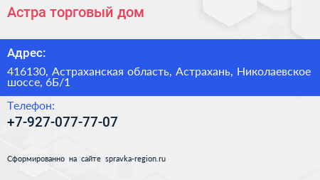 Астра, торговый дом по адресу 416130, Астраханская область, Астрахань, Николаевское шоссе, 6Б/1 в дальнейшем Организация, размещена в следующих категориях:
