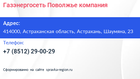 Газэнергосеть Поволжье, компания по адресу 414000, Астраханская область, Астрахань, Шаумяна, 23 в дальнейшем Организация, размещена в следующих категориях: