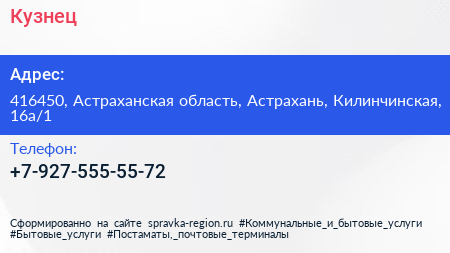 Кузнец по адресу 416450, Астраханская область, Астрахань, Килинчинская, 16а/1 в дальнейшем Организация, размещена в следующих категориях:
