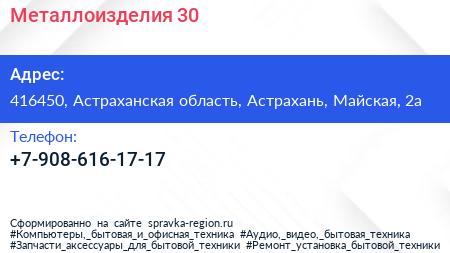 Металлоизделия. 30 по адресу 416450, Астраханская область, Астрахань, Майская, 2а в дальнейшем Организация, размещена в следующих категориях: