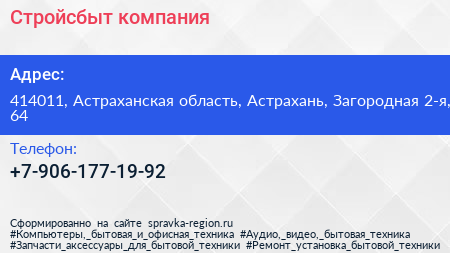 Стройсбыт, компания по адресу 414011, Астраханская область, Астрахань, Загородная 2-я, 64 в дальнейшем Организация, размещена в следующих категориях: