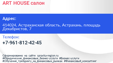 ART & HOUSE, салон по адресу 414024, Астраханская область, Астрахань, площадь Декабристов, 7 в дальнейшем Организация, размещена в следующих категориях: