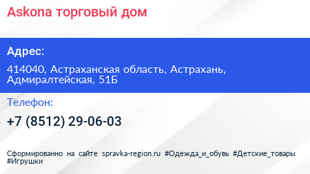 Askona, торговый дом по адресу 414040, Астраханская область, Астрахань, Адмиралтейская, 51Б в дальнейшем Организация, размещена в следующих категориях: