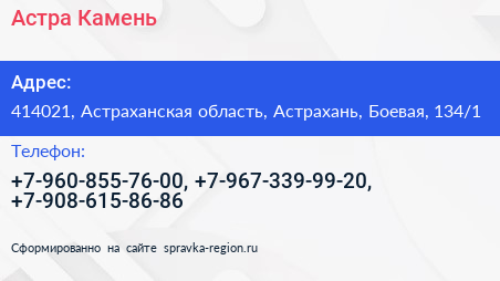 Астра-Камень по адресу 414021, Астраханская область, Астрахань, Боевая, 134/1 в дальнейшем Организация, размещена в следующих категориях: