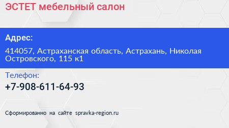 ЭСТЕТ, мебельный салон по адресу 414057, Астраханская область, Астрахань, Николая Островского, 115 к1 в дальнейшем Организация, размещена в следующих категориях: