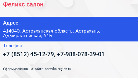 Феликс, салон по адресу 414040, Астраханская область, Астрахань, Адмиралтейская, 51Б в дальнейшем Организация, размещена в следующих категориях: