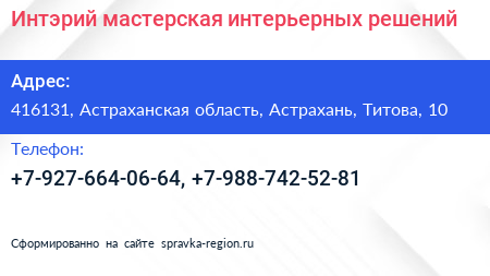 Интэрий, мастерская интерьерных решений по адресу 416131, Астраханская область, Астрахань, Титова, 10 в дальнейшем Организация, размещена в следующих категориях:
