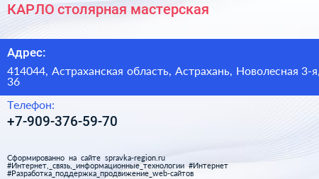 КАРЛО, столярная мастерская по адресу 414044, Астраханская область, Астрахань, Новолесная 3-я, 36 в дальнейшем Организация, размещена в следующих категориях: