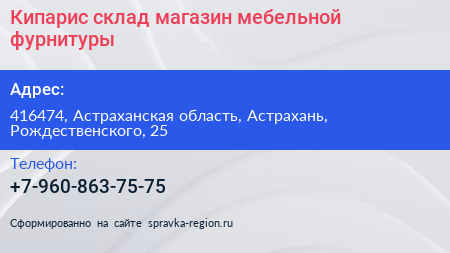 Кипарис, склад-магазин мебельной фурнитуры по адресу 416474, Астраханская область, Астрахань, Рождественского, 25 в дальнейшем Организация, размещена в следующих категориях: