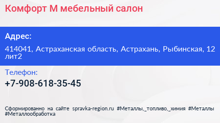 Комфорт-М, мебельный салон по адресу 414041, Астраханская область, Астрахань, Рыбинская, 12 лит2 в дальнейшем Организация, размещена в следующих категориях: