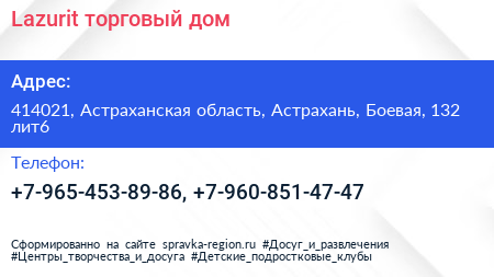 Lazurit, торговый дом по адресу 414021, Астраханская область, Астрахань, Боевая, 132 лит6 в дальнейшем Организация, размещена в следующих категориях:
