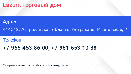 Lazurit, торговый дом по адресу 414018, Астраханская область, Астрахань, Ивановская, 2 в дальнейшем Организация, размещена в следующих категориях: