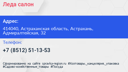 Леда, салон по адресу 414040, Астраханская область, Астрахань, Адмиралтейская, 32 в дальнейшем Организация, размещена в следующих категориях: