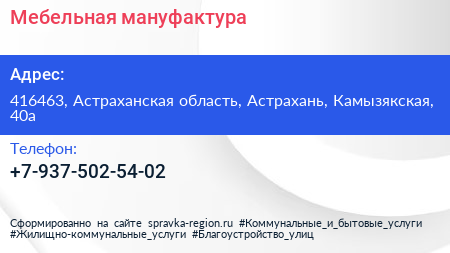 Мебельная мануфактура по адресу 416463, Астраханская область, Астрахань, Камызякская, 40а в дальнейшем Организация, размещена в следующих категориях: