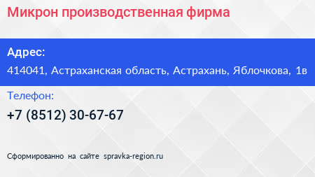 Микрон, производственная фирма по адресу 414041, Астраханская область, Астрахань, Яблочкова, 1в в дальнейшем Организация, размещена в следующих категориях: