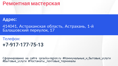 Ремонтная мастерская по адресу 414041, Астраханская область, Астрахань, 1-й Балашовский переулок, 17 в дальнейшем Организация, размещена в следующих категориях: