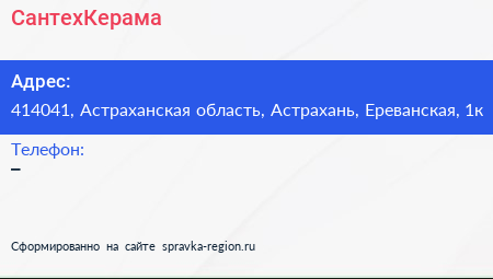 СантехКерама по адресу 414041, Астраханская область, Астрахань, Ереванская, 1к в дальнейшем Организация, размещена в следующих категориях: