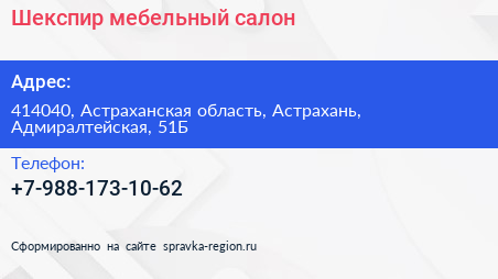 Шекспир, мебельный салон по адресу 414040, Астраханская область, Астрахань, Адмиралтейская, 51Б в дальнейшем Организация, размещена в следующих категориях: