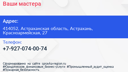 Ваши мастера по адресу 414052, Астраханская область, Астрахань, Красноармейская, 27 в дальнейшем Организация, размещена в следующих категориях: