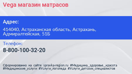 Vega, магазин матрасов по адресу 414040, Астраханская область, Астрахань, Адмиралтейская, 51Б в дальнейшем Организация, размещена в следующих категориях: