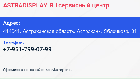 ASTRADISPLAY.RU, сервисный центр по адресу 414041, Астраханская область, Астрахань, Яблочкова, 31 в дальнейшем Организация, размещена в следующих категориях: