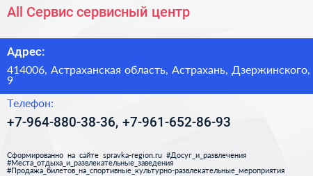 All-Сервис, сервисный центр по адресу 414006, Астраханская область, Астрахань, Дзержинского, 9 в дальнейшем Организация, размещена в следующих категориях: