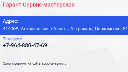 Гарант Сервис, мастерская по адресу 414009, Астраханская область, Астрахань, Пархоменко, 81 в дальнейшем Организация, размещена в следующих категориях: