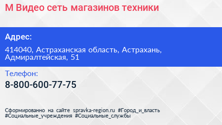 М.Видео, сеть магазинов техники по адресу 414040, Астраханская область, Астрахань, Адмиралтейская, 51 в дальнейшем Организация, размещена в следующих категориях: