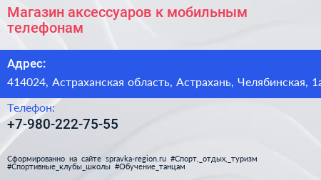 Магазин аксессуаров к мобильным телефонам по адресу 414024, Астраханская область, Астрахань, Челябинская, 1а в дальнейшем Организация, размещена в следующих категориях: