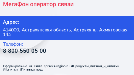 МегаФон, оператор связи по адресу 414000, Астраханская область, Астрахань, Ахматовская, 14а в дальнейшем Организация, размещена в следующих категориях: