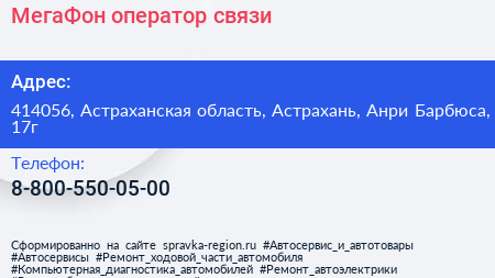 МегаФон, оператор связи по адресу 414056, Астраханская область, Астрахань, Анри Барбюса, 17г в дальнейшем Организация, размещена в следующих категориях: