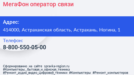 МегаФон, оператор связи по адресу 414000, Астраханская область, Астрахань, Ногина, 1 в дальнейшем Организация, размещена в следующих категориях: